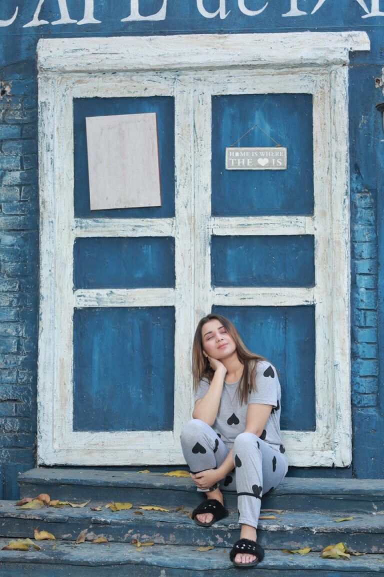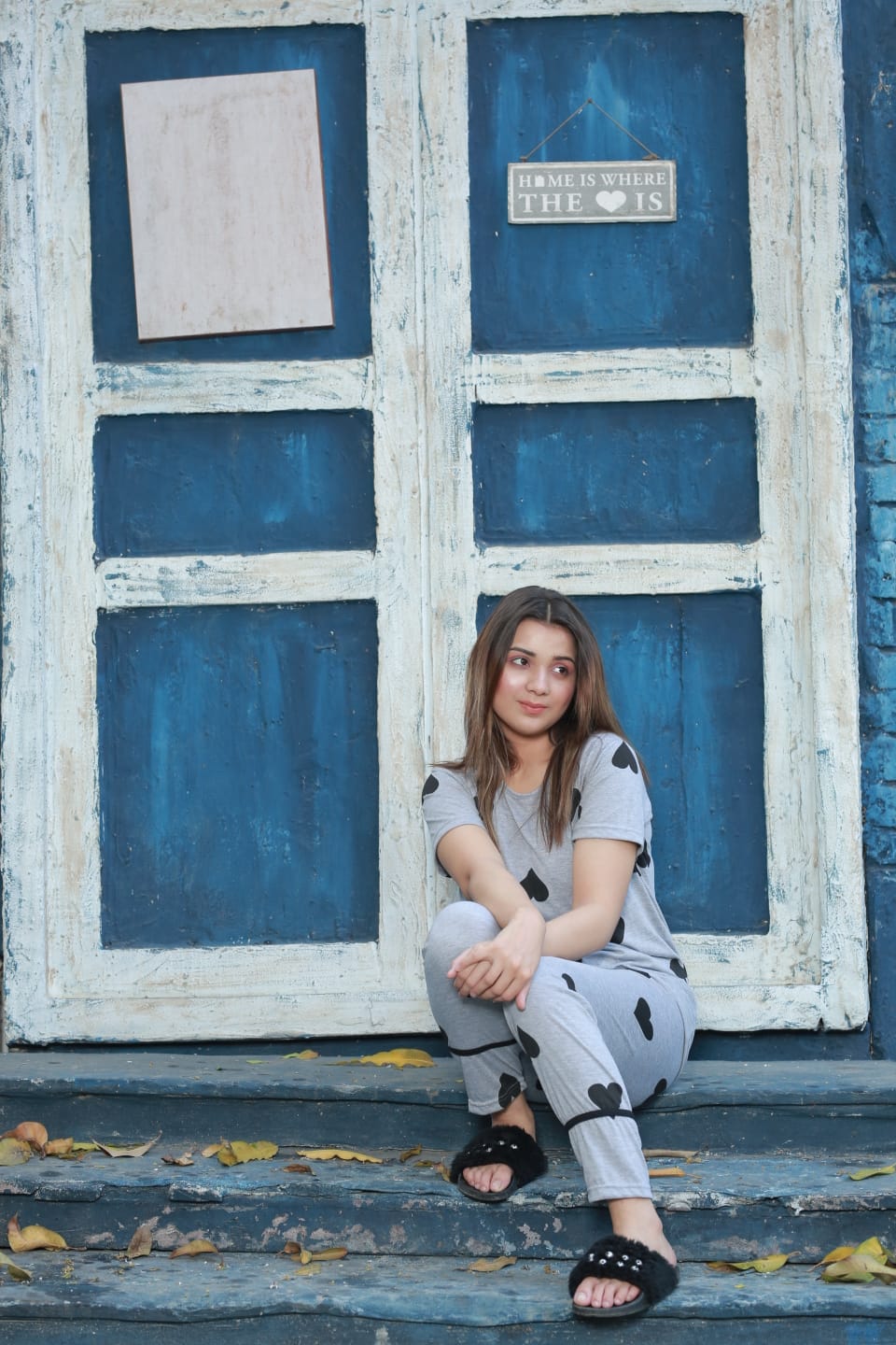 Grey and Black Hearts Print Half Sleeves Night Suit for her